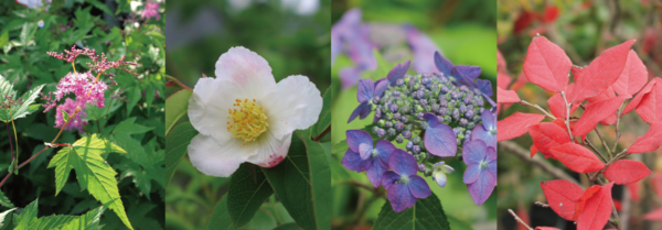 何千種類もの茶花や草花と樹木をそろえ、屏風にもたとえられる耳納連山を背景に、鉢植えから地植えの成木まで、四季折々の表情や、成長の具合を、その場で実際に見て体感していただけます。