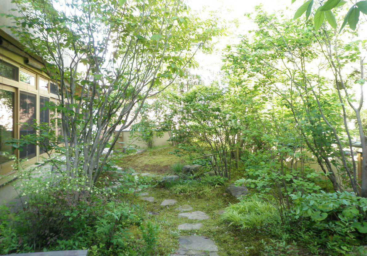 数寄屋造りのお宅で数寄屋門から玄関への前庭、中庭、座敷北側の庭、南の主庭があります。 主庭の南にある病院と中庭を緑で覆い目線を隠すように樹木を配置しています。 植物好きの施主さんのおかげで伸び伸びと仕事をさせて頂きました。 2 期工事で塀と中庭をつくり、3 期工事でウリン材のデッキ、石貼り工事を行いました。 それぞれの木々も随分と大きくなり、数年ごとに枝抜きや切り戻しを行っています。 その場に応じた雰囲気の庭ができています。