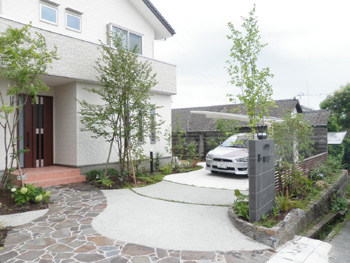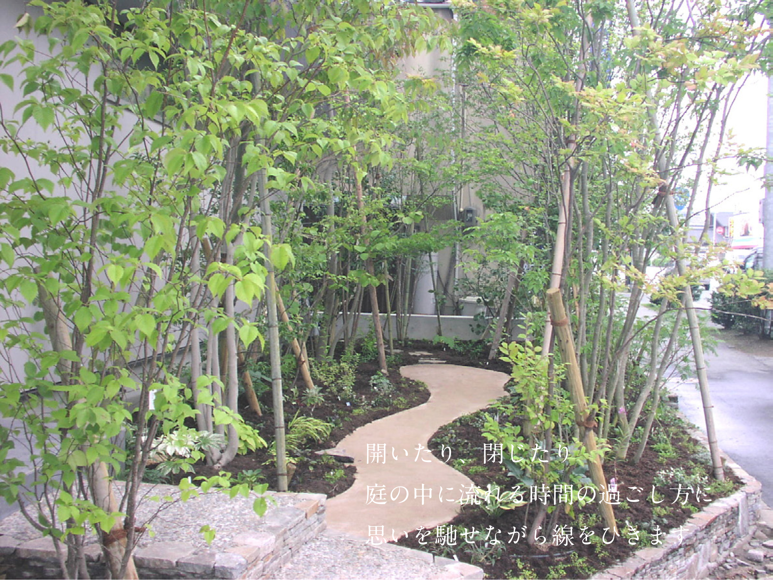 建築前の段階からの打ち合わせでした。国道沿いの角地でまちなかで一番目立つ場所にあるものの、 道路拡張工事の可能性から建築が出来ないスペースを有効に使えないかというご相談でした。 ならば、森のような空間があれば、道行く人、交差点で待つ人が、緑を見て癒されるのではと思いました。 モダンなお宅で2 階がダイニングでした。隣の駐車場からの目線を隠すこともあり、高さ7m のヤマボウシを植栽しました。 ヤマボウシは葉の上に花が咲くため、下からはあまり見えませんが、2 階の窓からは6 月ごろ目の前に真っ白な4 枚弁の花が広がります。 ある春の日、庭の調子を見に行ったとき、しばらく、道行く人がどう見ているだろうかと観察していました。緑を見上げている人、 何気なく横を通り過ぎてゆく人、咲いている花に目を奪われて寄っていく人、樹木や草花に着けている名札をメモしていく人。 皆さんの顔が、ほころんでやさしい顔になってゆくのが感じられました。