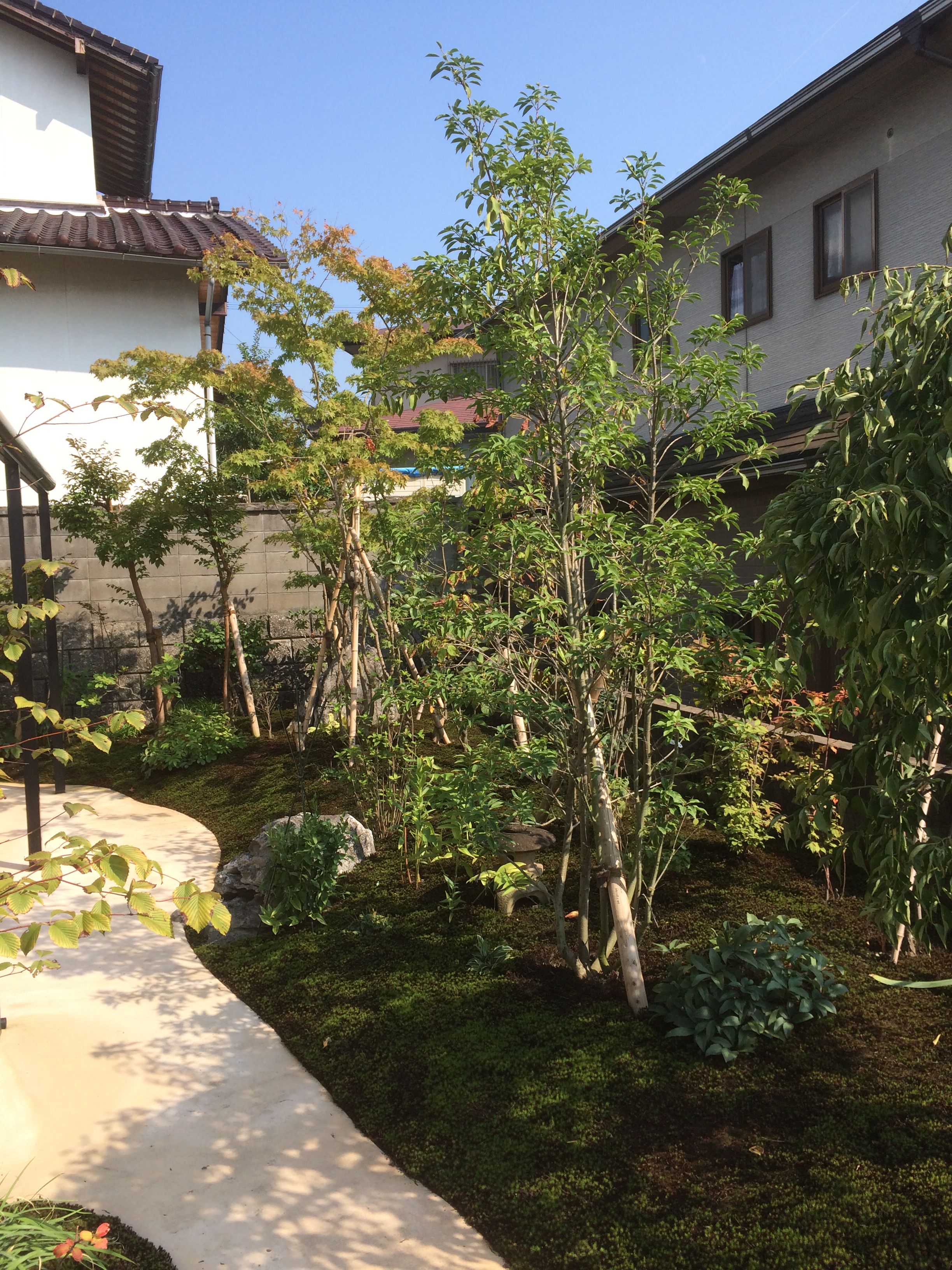 庭づくりが趣味の施主様が手入れがしやすく楽しめるように、 既存の樹木を活かしながら整理したいというご要望。 プロの手が必要な部分に重点を置いたリ・ガーデン施工。 自然素材の舗装の両側に既存樹木を配置し直し、杉苔とも調和の取れた 緑を楽しめる庭へ。防草対策も万全です。